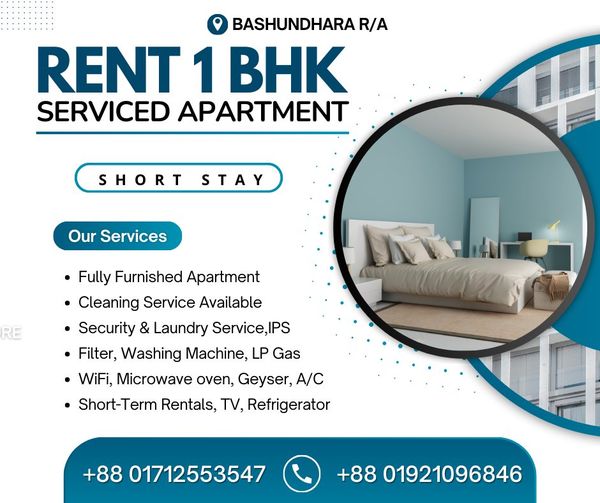1BHK Serviced Apartment RENT With Modern Furniture In Bashundhara R/A. Short-Term Rentals with Kitchen, TV, Refrigerator, WiFi, Microwave oven, A/C.