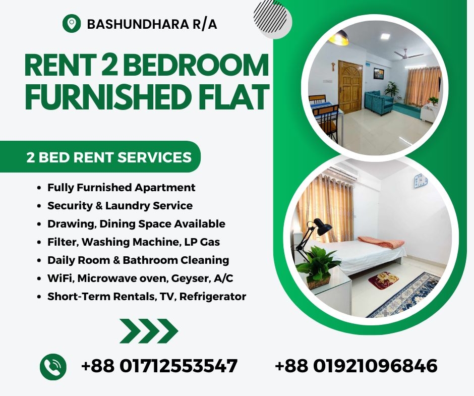 Furnished 2 Bedroom Serviced Apartment RENT in Bashundhara R/A. Short-Term Rentals are available with Kitchen, TV, Geyser, Refrigerator, WiFi, Microwave oven, A/C.