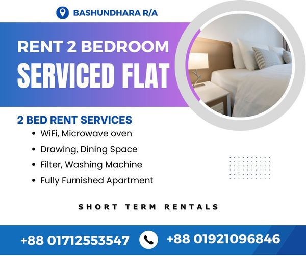 Furnished 2BHK Serviced Apartment RENT in Bashundhara R/A. Short-Term Rentals are available with Kitchen, TV, Geyser, Refrigerator, WiFi, Microwave oven, A/C.