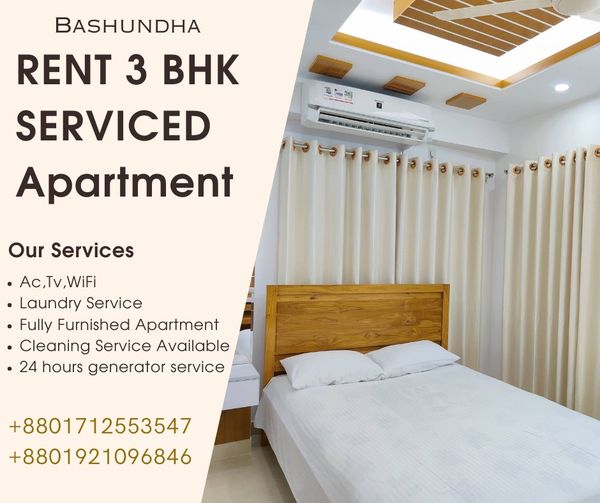 Elegant **3-Bedroom Apartment** for **Rent** in Bashundhara R/A with Premium Services. Offers Short-Term Rentals, a fully equipped Kitchen, TV, Geyser, Fridge, WiFi, Microwave, and AC.